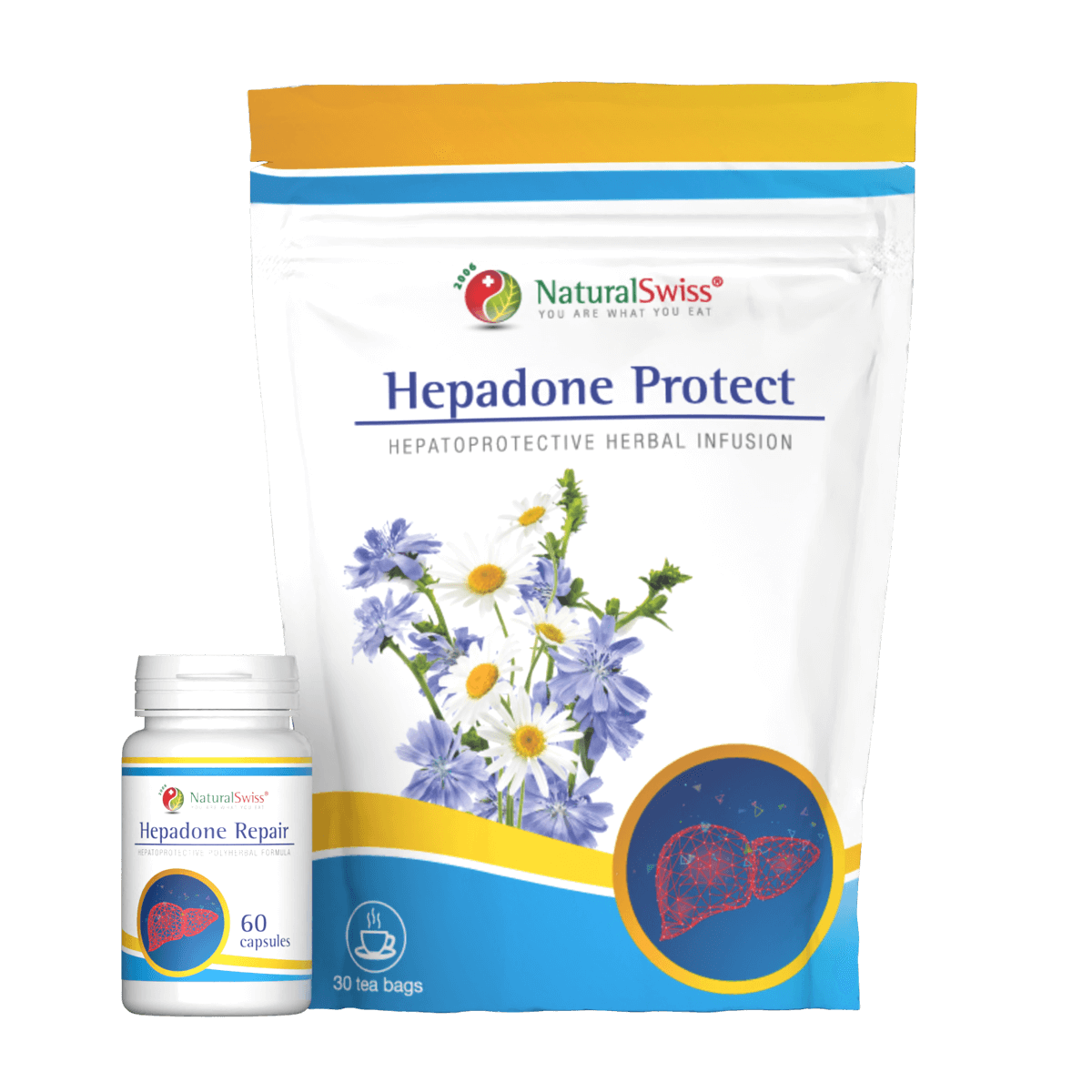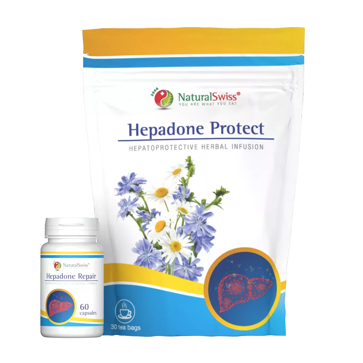 Dvojfázový prístup: kapsuly Hepadone Repair s bylinnými extraktmi na ochranu a obnovu pečeňového tkaniva a bylinný čaj Hepadone Protect na každodennú jemnú podporu detoxikačných procesov.
