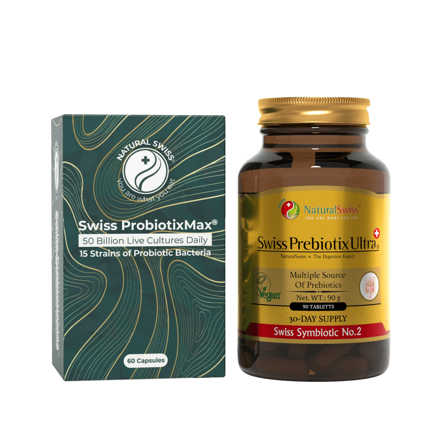 NaturalSwiss® SymbiotiX je prebiotický a probiotický výživový doplnok obsahujúci starostlivo vybrané baktériové kmene. Obsahuje dva prípravky – Swiss ProbiotiX Max®, ktorý zahŕňa 15 druhov prospešných baktérií, a Swiss PrebiotiX Ultra®, bohatý na frukto-oligosacharidy, ktoré slúžia ako výživa pre tieto baktérie. Kapsuly s oneskoreným uvoľňovaním, ktoré sa rozpúšťajú v črevách, a tablety sú vhodné aj pre osoby dodržiavajúce vegetariánsku stravu. Prípravok neobsahuje prídavné látky, pšenicu, kofeín, sóju, kukuricu, cukor, vajcia, mlieko, konzervačné látky ani farbivá.