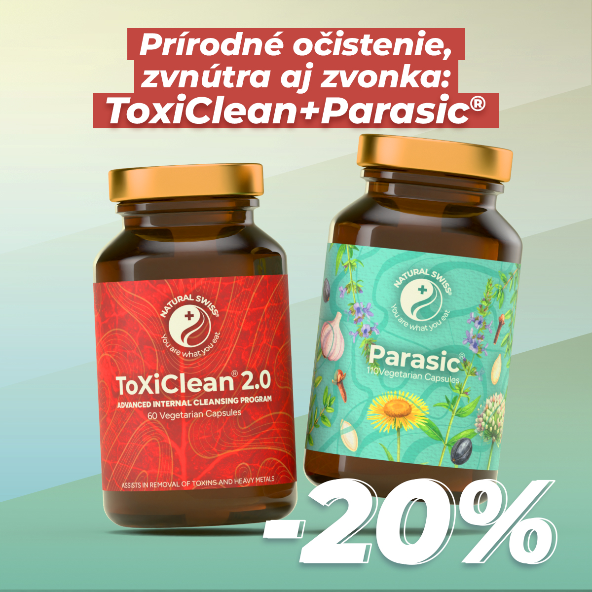 ToxiClean® 100% prírodné aktívne zložky kapsuly môžu pomôcť odstrániť z tela najčastejšie toxické ťažké kovy. Kapsula Parasic® je antiparazitárny prípravok, ktorý obsahuje rastlinné aktívne zložky, ktoré bojujú proti vnútorným parazitom.